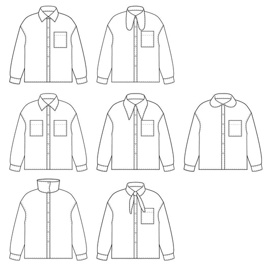 This set includes 7 different collars that can be attached to our Otto shirt neckline. They are divided into two categories : collars with collar stands (classic collar, banana collar) and collars with no collar stands, of which they are 5 (classic collar, pointed collar, peter pan collar, high collar and knotted collar).